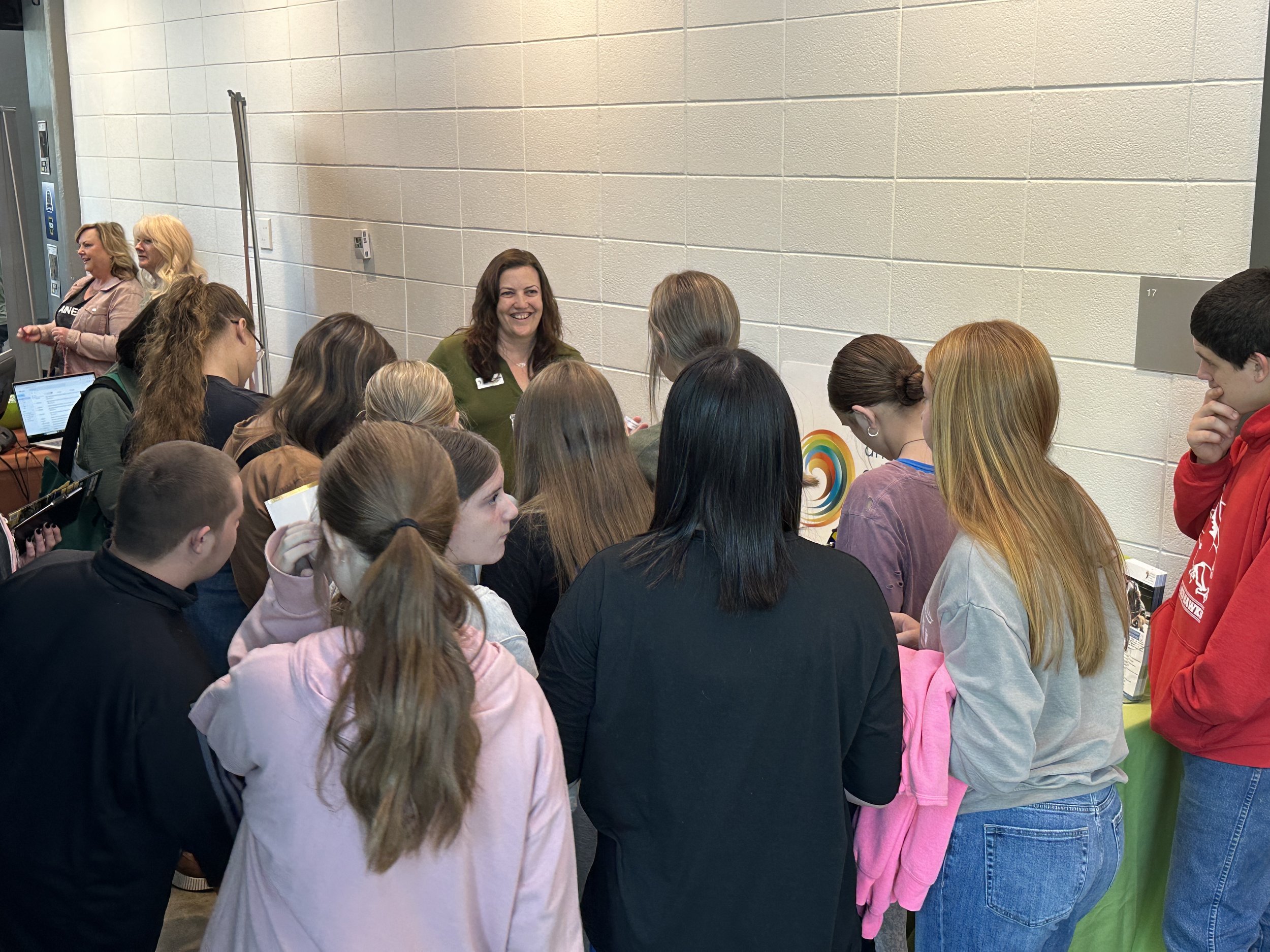 A woman speaking to a group of students in a room. Some students are lined up near a table with a laptop and a basket on it. Several students are looking at a display in the background. The setting appears to be an educational workshop or event.
